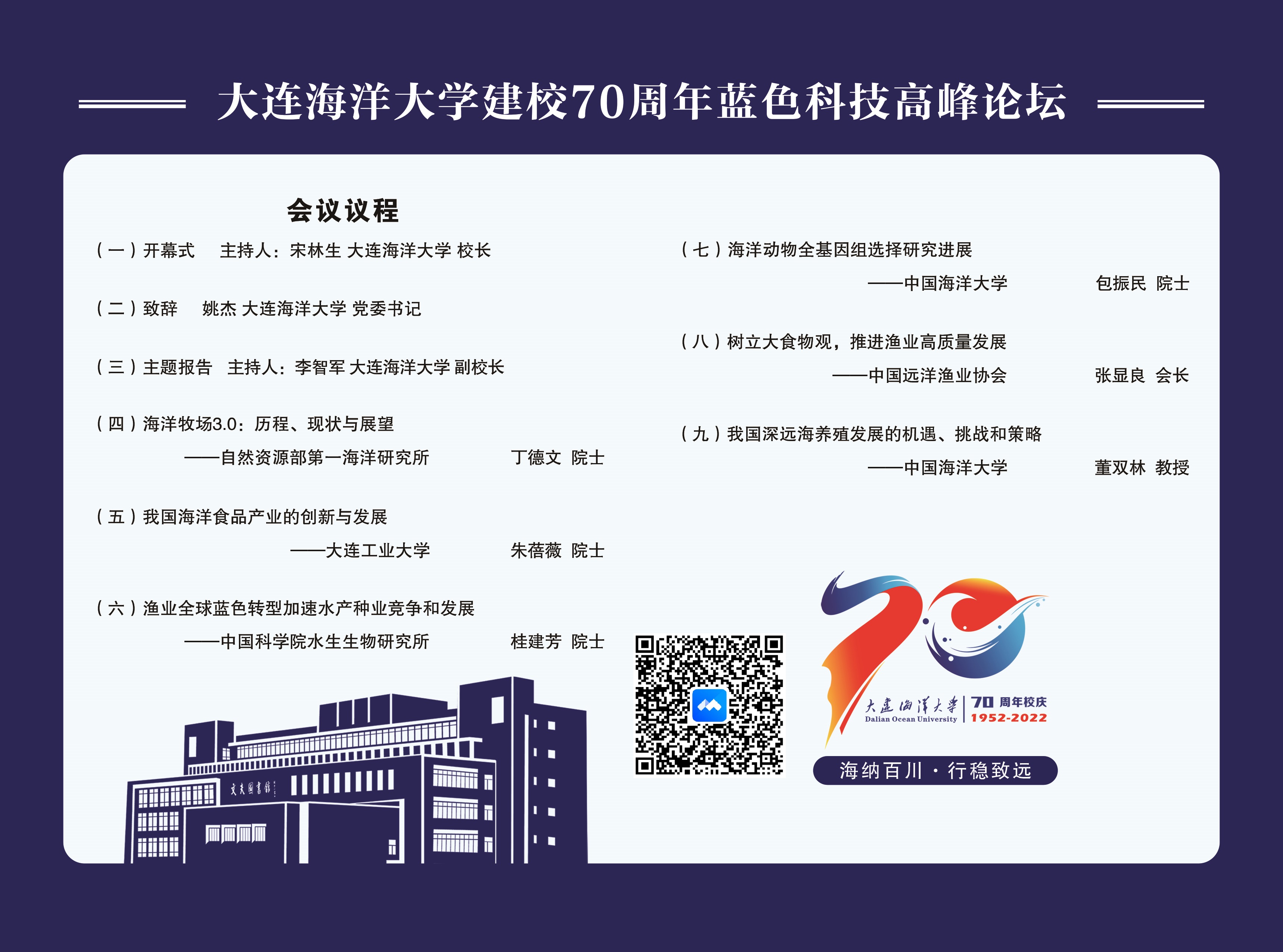 壬寅盛世,藍色華章。在全黨全國上下持續掀起學習貫徹黨的二十大精神熱潮之際,大連海洋大學迎來建校70周年。七十年春風化雨,七十年樂育英才,七十年舉棟興邦,值此學校七十華誕之際,大連海洋大學擬于12月17日14:00-17:00采取線上線下相結合方式舉辦以“勇毅前行七十載,藍色科技開新篇”為主題的高峰論壇,并進行現場直播。論壇圍繞深藍遠洋漁業、藍色種業芯片、藍色糧倉與海洋功能食品、智慧海洋、海洋經濟文化進行深入研討與交流,助力新時代海洋事業高質量發展。