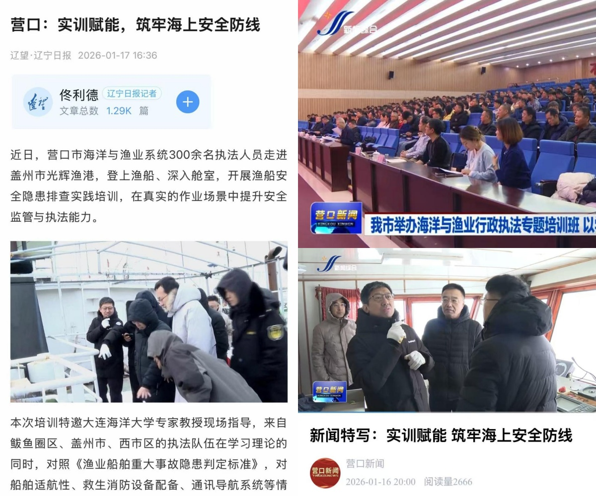 近日,遼寧日報·遼望客戶端及營口廣播電視臺對我校船員培訓學院承辦的“營口市海洋與漁業行政執法業務能力提升專題培訓班”進行了報道。本次培訓共有當地300余名漁業行政執法人員參加,圍繞當前漁業安全生產的核心任務,采取“理論授課+實操訓練”的模塊化教學模式,著力提升執法隊伍的專業素養和履職能力。
