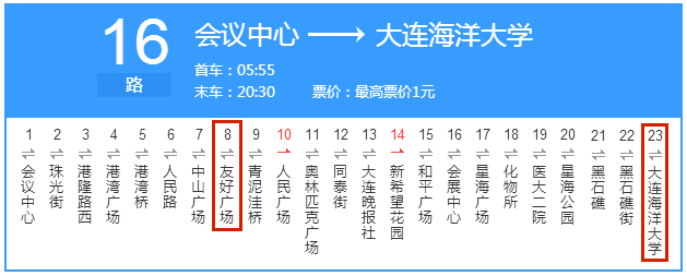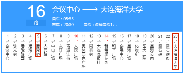 2. 乘坐16路公交車:港灣橋站 → 大連海洋大學站