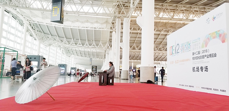 為積極配合杭州市文創產業發展,大力推進城市國際化戰略,打造文化、品質機場,2018年9月10日,航站區管理中心聯合杭州市委宣傳部、市文創辦、市會展辦在T1航站樓7號門內舉辦了"2018年杭州市文化博覽會"杭州蕭山國際機場分會場啟動儀式,儀式上表演了精彩的古箏演奏以及民族舞蹈,吸引現場旅客駐足觀看。同時機場航站樓作為此次文博會的分會場,通過現場陳列的櫥窗及柜臺向旅客展示了工藝精美、造型獨特的文創產品,從而進一步提升航站樓文化元素,為加快杭州市成為國際文化創意中心推波助瀾。