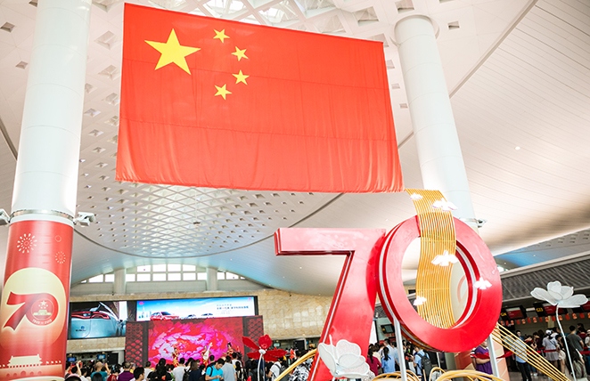為慶祝新中國成立70周年,9月中旬,在T1、T2、T3航站樓出發層懸掛巨幅國旗、陳設國慶景觀布展,吸引了大批出行旅客合影留念,進一步充實樓內豐富多彩的國慶節日氛圍。9月30日上午,航站區中心聯合各單位在T3航站樓出發大廳舉辦以“這一抹中國紅”為主題的國慶文藝匯演。演出現場精心呈現了歌曲演唱、舞蹈表演、樂器演繹等10個表演節目,激揚的歌聲、優美的旋律、動人的舞蹈和有趣的知識問答互動,吸引了旅客駐足觀賞,共同慶祝新中國成立70周年,為祖國的繁榮昌盛送上最真摯的祝福。