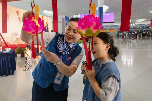 一組悠揚的民樂組曲拉開活動序幕,旅客紛紛向舞臺中央聚攏。航站區中心活動主持人上臺向旅客介紹杭州機場服務品牌“杭行無憂”的誕生記,以及此次活動內容。與以往節慶文化活動不同,此次活動增添員工風采展示部分,航站區中心員工、空港百靈和黨員初心站社會志愿者分別向旅客演唱歌曲和詩歌朗誦,一首男女合唱的《私奔到月球》更是引起旅客歡呼。活動現場,兩位身著漢服的工作人員以“對答詩詞”的形式帶領旅客體會古時文人墨士對中秋佳節的歌頌,貴賓公司工作人員則邀請旅客進行“猜燈謎”,品嘗親制烘焙的月餅。