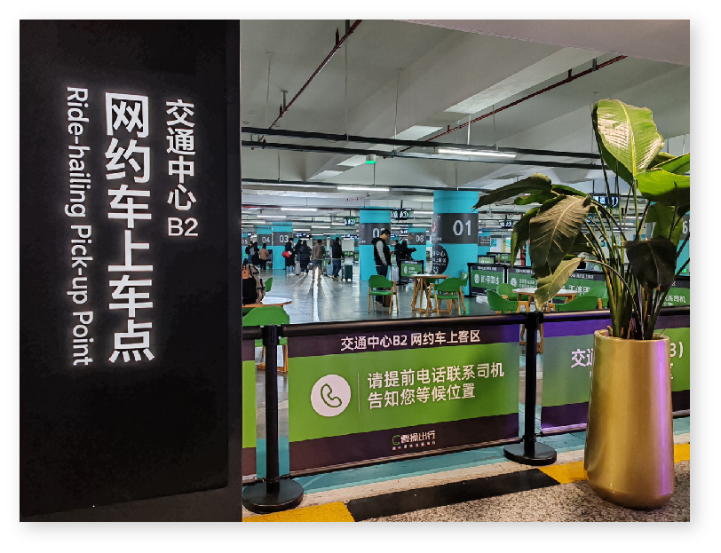 1.網約車上客區設有旅客休息區,配備休息桌椅、自動售貨機、飲用水、網約車輛進場信息智慧屏等設施供旅客使用。