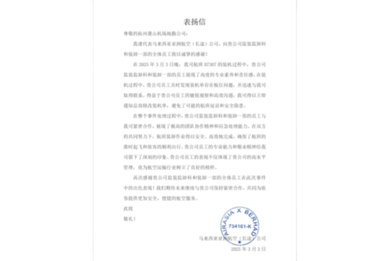 3月5日,地勤公司收到馬來西亞亞洲航空(長途)公司發(fā)來的感謝信,信中感謝2日晚在D7307航班保障中地勤公司憑借專業(yè)能力與敬業(yè)精神,使原本可能拉卸的3塊貨板、4365KG貨物成功出運。